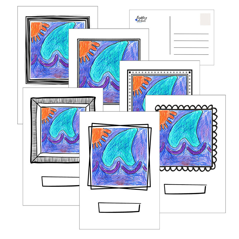 Set of 12 postcards printed with your child’s masterpiece on one side, and postcard lines on the backside. Two of each 6 different designs.